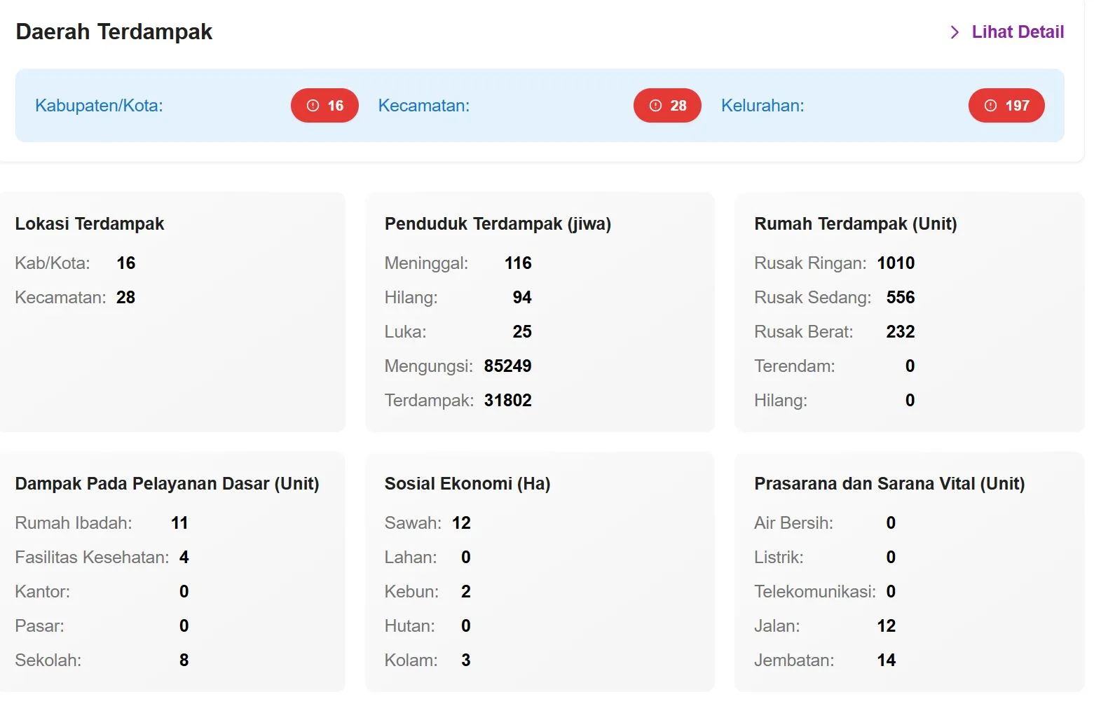 Data dampak bencana banjir menunjukkan total 116 jiwa meninggal dunia, 94 jiwa masih dinyatakan hilang, dan 25 jiwa mengalami luka.