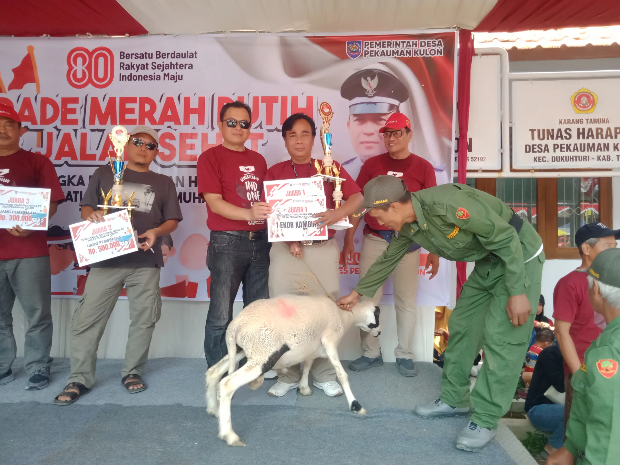 “Karnaval jalan sehat ini sebagai puncak peringatan HUT RI ke-80 yang sebelumnya telah dilaksanakan perlombaan tingkat RT RW diantaranya, Badminton, Tenis meja, Karaoke, Bacaan ayat pendek Alquran untuk anak-anak”.