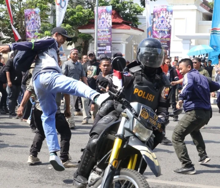 Beritamerdeka.co.id – Gerbang Balai Kota Tegal mendadak riuh pada Kamis (23/4/2026). Ratusan massa terlibat aksi saling dorong dengan petugas keamanan hingga berujung pada situasi ricuh. Namun, ketegangan tersebut bukanlah kejadian sebenarnya, melainkan bagian dari Simulasi Penanganan Kerusuhan Unjuk Rasa yang digelar sebagai bentuk kesiapsiagaan menghadapi dinamika sosial di wilayah Kota Tegal.