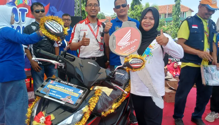 Adalah Purwanti warga Desa Mejasem Barat yang tinggal di Jl Pala 8 yang paling bahagia dari ribuan peserta jalan sehat, sebab dialah yang berhasil membawa pulang hadiah sepeda motor Honda Beat