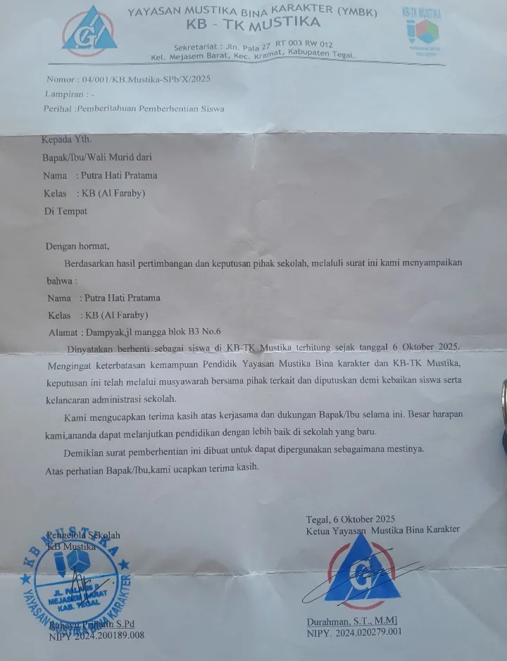 Melalui surat nomor 04/001/KB.Mustika-SPb/X/2025 yang ditandatangani Pengelola KB-Tk Mustika, Rahayu Prihatin, S.Pd dan Ketua Yayasan Mustika Bina Karakter, Durahman, ST.,MM dengan jelas menyampaikan perihal Pemberitahuan Pemberhentian Siswa.