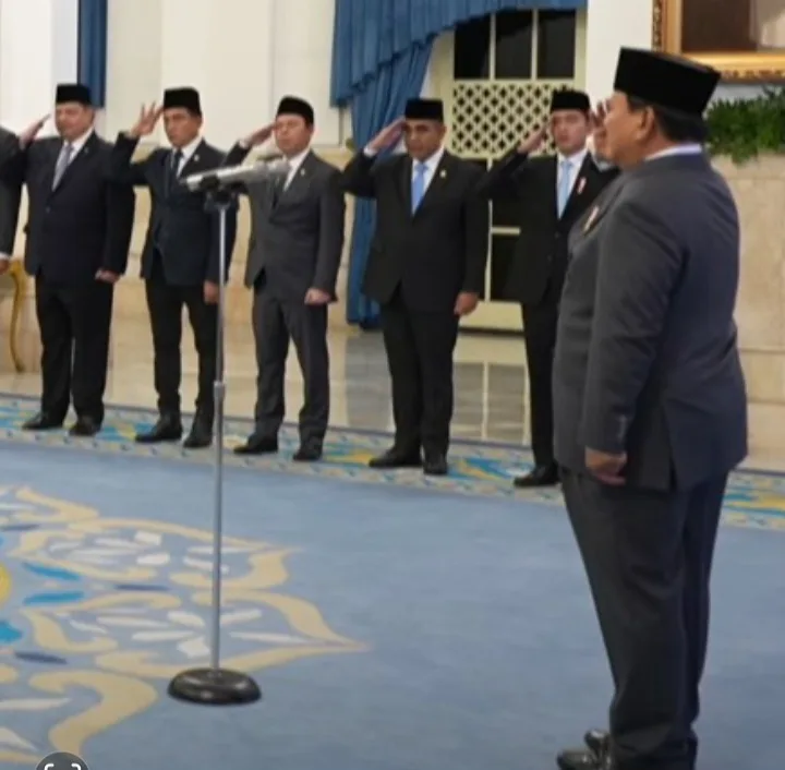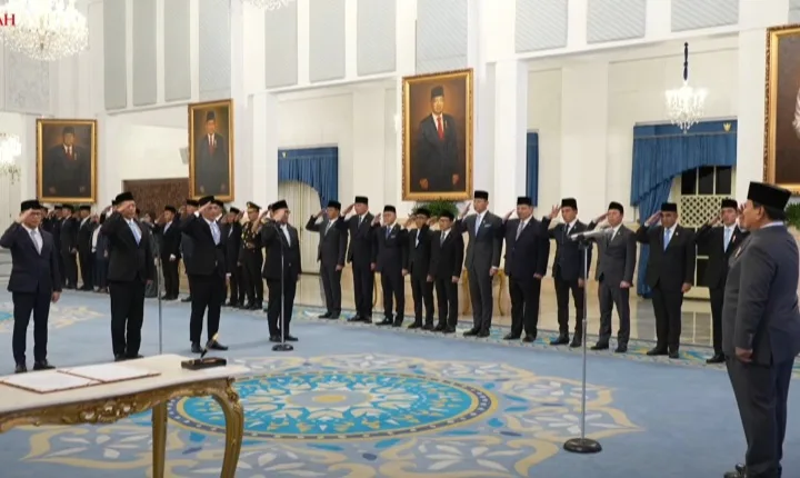 Usai pembacaan sumpah, para pejabat yang baru dilantik perkuat kabinet, menandatangani berita acara pelantikan yang disaksikan langsung oleh Presiden Prabowo.