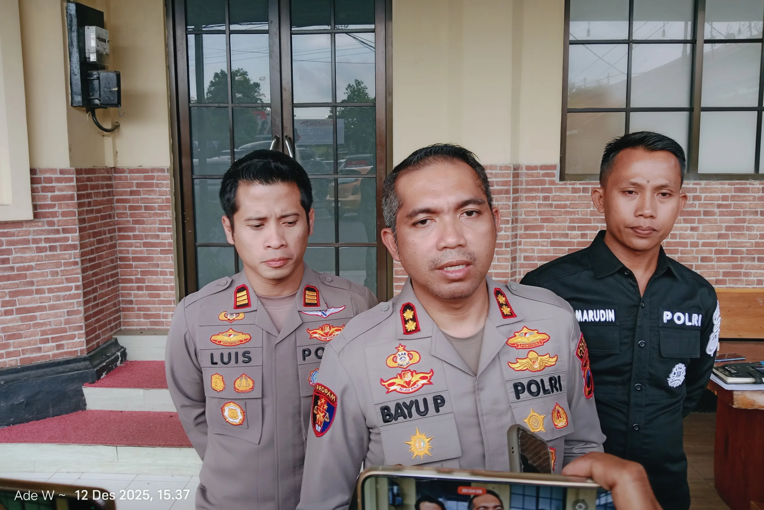 Kapolres Tegal AKBP Bayu Prasatyo didampingi Kasat Reskrim dan Kasi Humas memberikan keterangan pers terkait kematian satu keluarga di Tol Pejagan-Pemalang (Ade W/beritamerdeka.co.id)