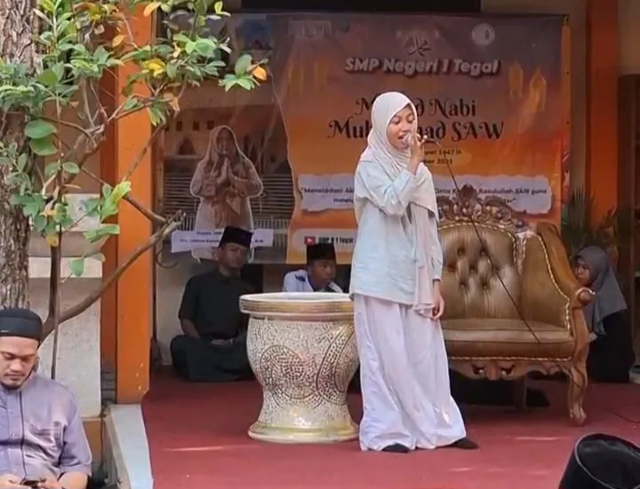 Pergelaran peringatan Maulid Nabi SMP Negeri 1 Tegal dengan Kepala Sekolah Dra. Listiana Kusuma Wardani, diikuti seluruh pelajar bernuansa Muslim.